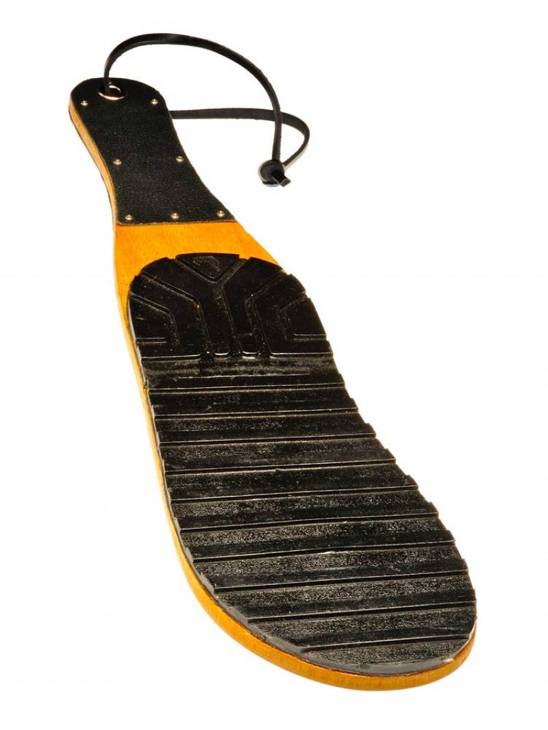 Wooden paddle with a real jack boot sole attached so you can deliver a size 12 foot print! The marks left behind will really look like someone's had a good ass kicking. With only a little effort this perfectly balanced paddle can leave its signature mark. The large surface area, wood flexibility and easy grip handle with wrist strap gives the paddle a real sting in its tail!