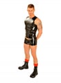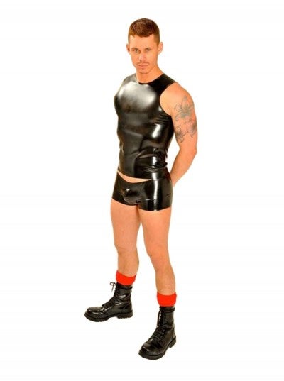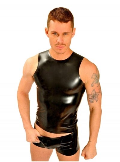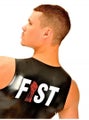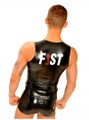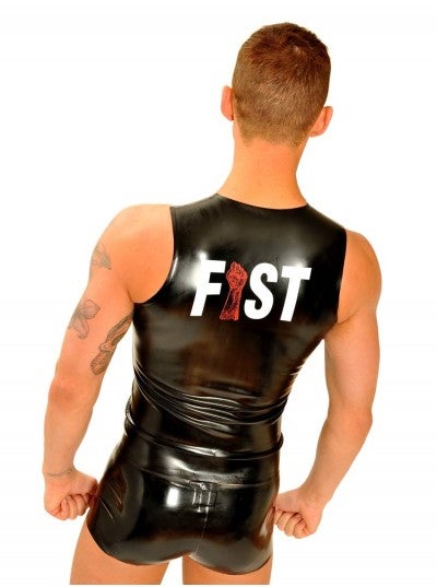The cut of this rubber t-shirt will highlight your muscular physique to the max. With the FIST logo printed large in white and red across the back, you'll stand out in the crowd. Constructed from 0.45mm black latex, you'll never want to take off this sleeveless rubber classic.