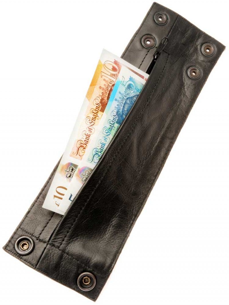 Soft leather 80mm wide wrist wallet that looks good to wear, but is practical too with a hidden zippered wallet inside, that's perfect to carry your cash. Press studs let you adjust the size.